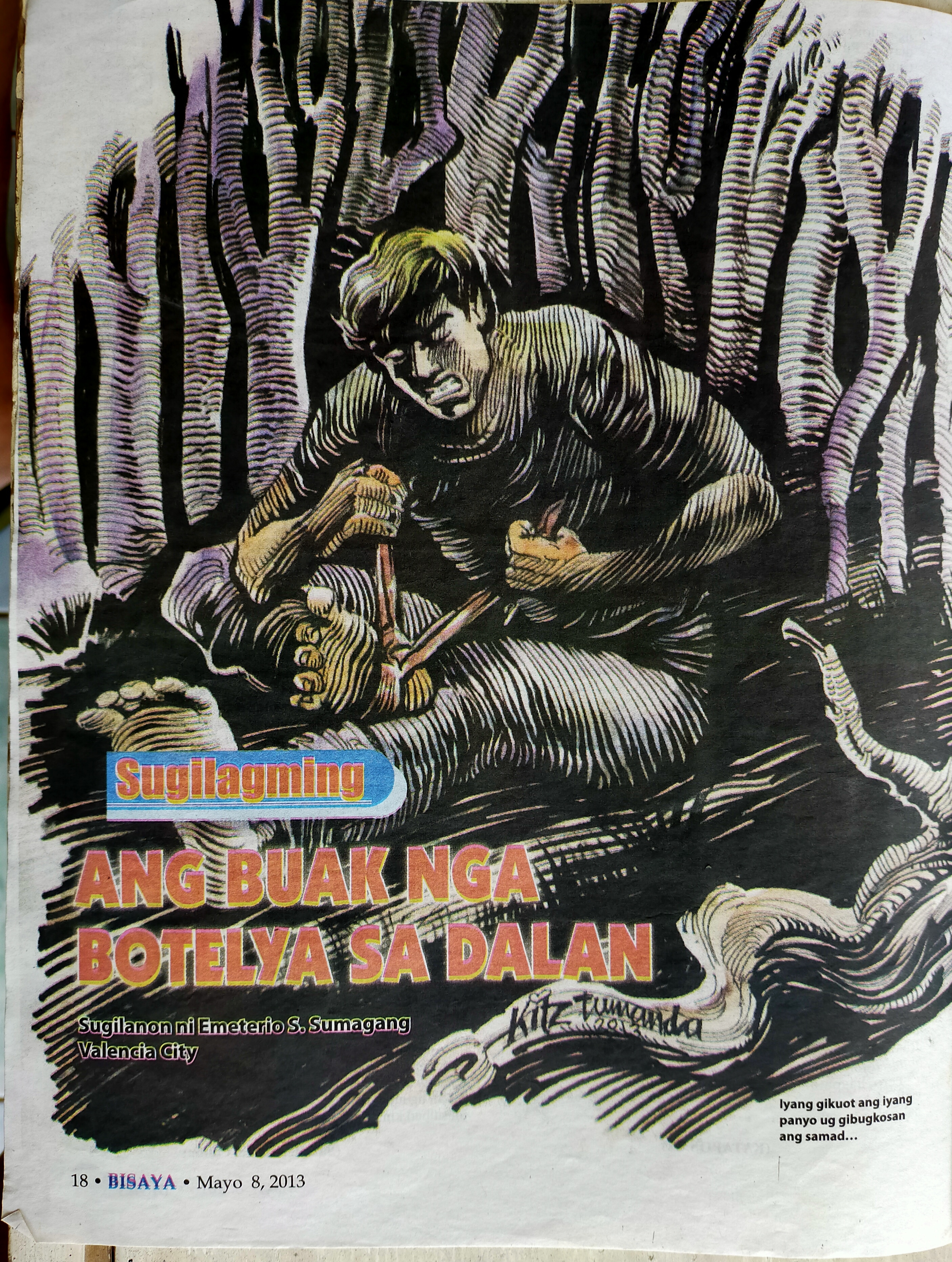 Wala na magsinilas si Fausto kay sagabal sa paglakaw. Paspas ang iyang mga lakang. Tungod sa kataranta napandol siya sa migatawng bato sa dalan nga nahaga sa panahon, ulan ug tunob sa kabaw ug kabayo. Milupad ang iyang plaslayt ug nahulog sa dal-og. Maayong pagkasuksok sa sampinit sa lugot kay bisan ang siga niini natabonan man. Mipadayon si Fausto sa pagbaktas nga way iwag. Dili mahimong maglangan siya kay basin manganak ang iyang asawa nga way mananabang. Misalig siya sa iyang mga tiil nga makatultol sa agianan. Apan kalit lang nahaigking si Fausto sa kasakit. Maayong pagkatusok ang atay-atay sa iyang lapalapa sa usa ka mahait nga butang. Milingkod siya sa dalan ug giibot ang buak nga botelya nga mitaop sa iyang lapalapa. Misidlit ang dugo ug nabati sa iyang mga tudlo ang kainit niini. Iyang gikuot ang iyang panyo ug gibugkosan ang samad. Mihunong ang pagsidlit sa dugo apan moagas kinig balik sa matag lakang ni Fausto. Wala niya kini panumbalinga kay maoy mipasulabi sa iyang hunahuna ang nagbati nga asawa. Bisan nangluspad, mipadayon si Fausto sa pag-aginod subay sa hiktin ug mangitngit nga dalan.