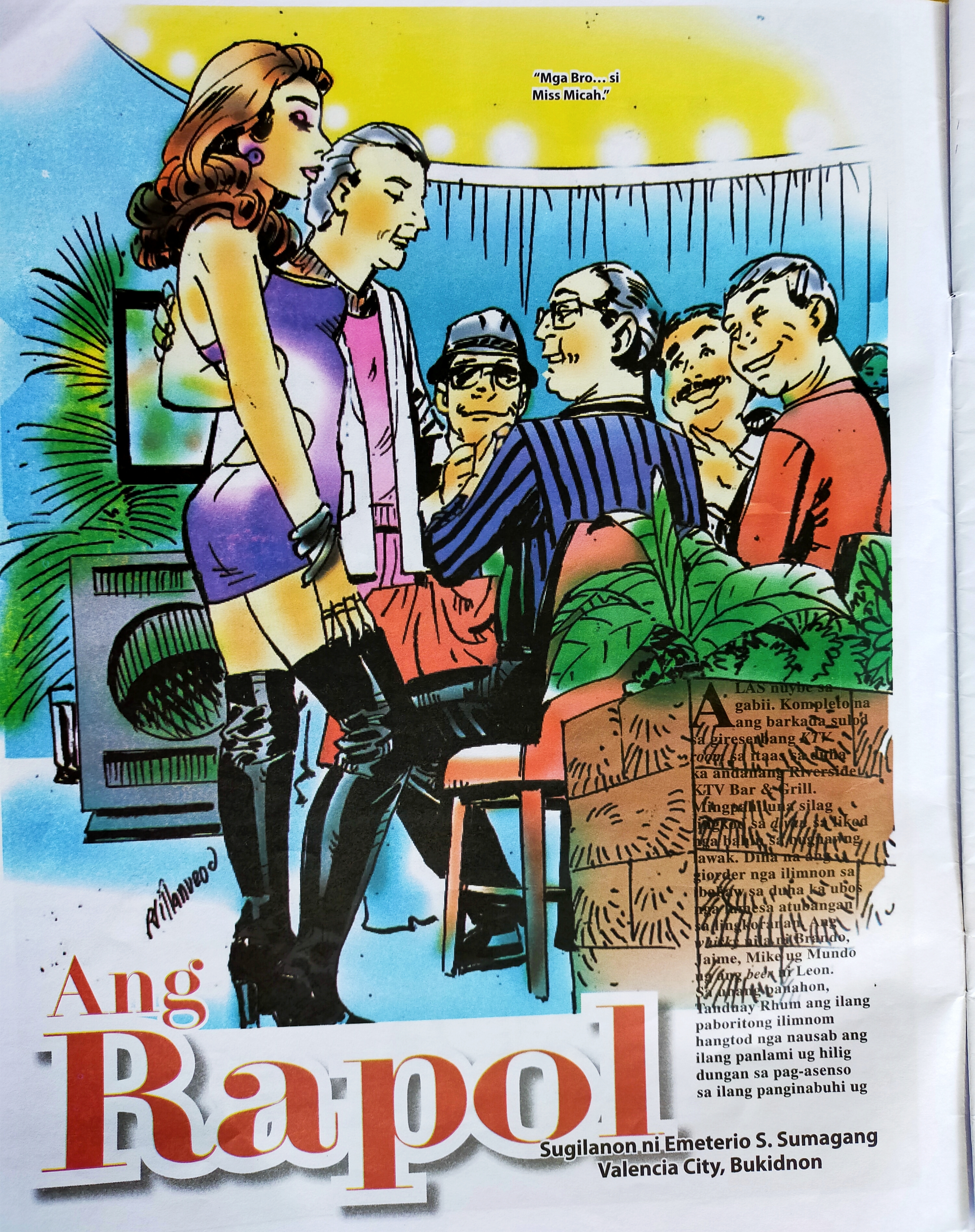 Alas-nuwebe sa gabii. Kompleto na ang barkada sulod sa gireserbang KTV room sa itaas sa duha ka andanang Riverside KTV Bar & Grill. Mingpahiluna silag lingkod sa divan sa likod nga bahin sa bugnawng lawak. Diha na ang giorder nga ilimnon sa ibabaw sa duha ka ubos nga lamesa atubangan sa lingkoranan. Ang whisky nila ni Brando, Jaime, Mike ug Mundo ug ang beer ni Leon. Sa unang panahon, Tanduay Rhum ang ilang paboritong ilimnom, hangtod nga nausab ang ilang panlami ug hilig dungan sa pag-asenso sa ilang panginabuhi ug sa pagsaka sa ilang pagkabutang sa katilingban. Gawas ni Leon nga napugos pagbalhin sa serbesa kay mag-alburuto ang tiyan.