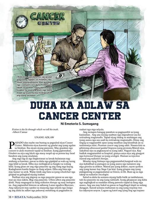 Pasado alas-nuybe nas buntag sa pagsulod niyas Cancer Center. Midiretso siyas kawnter ug gisulat ang iyang ngalan sa listahan. Ika-siyam siyang pasyente. May giandan nga consent to daily treatment tapad sa listahan. Iyang gipirmahan. Gisabot na niya ang klerk nga maoy mopil-ap sa porma kay lisod basahon ang iyang sinulatan.