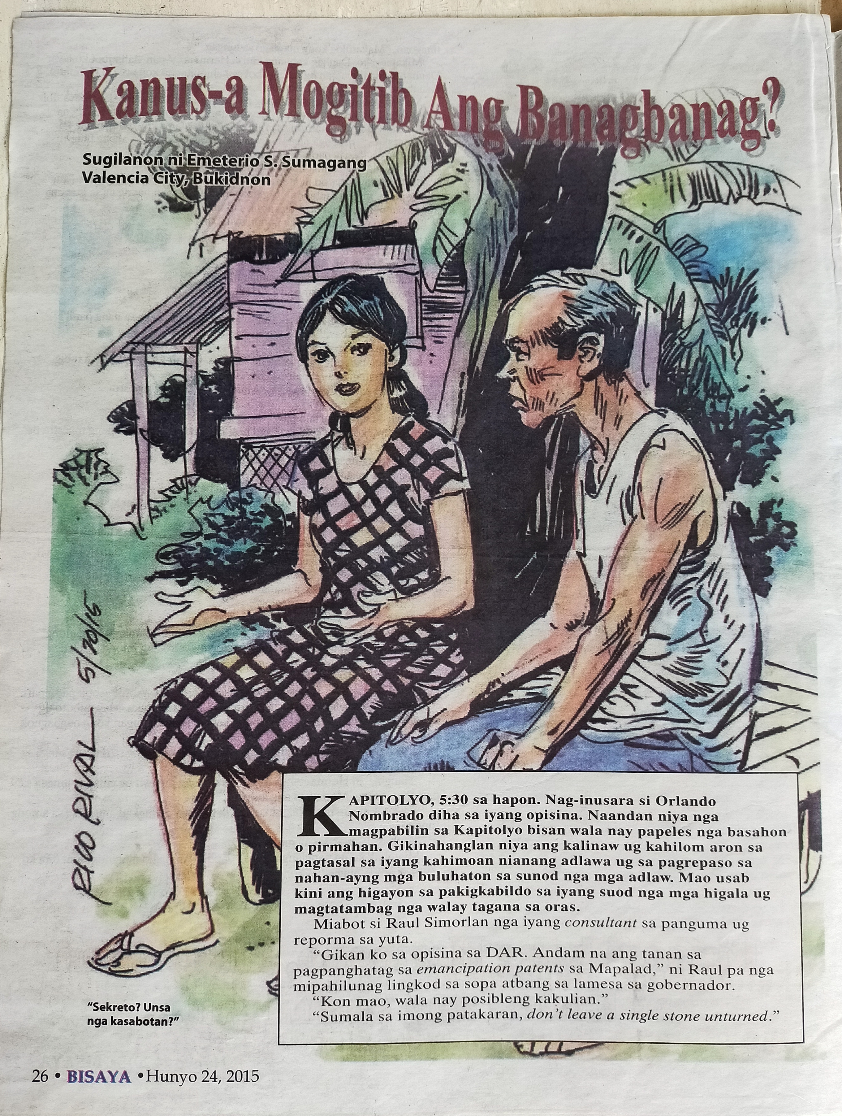 “Gikan ko sa opisina sa DAR. Andam na ang tanan sa pagpanghatag sa emancipation patents sa Mapalad,” ni Raul pa nga mipahilunag lingkod sa sopa atbang sa lamesa sa gobernador.