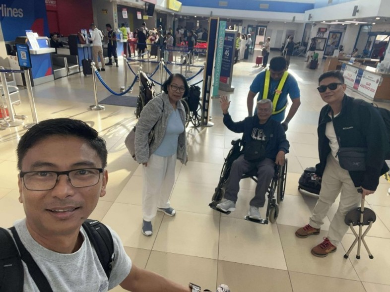 Naghangyo si Yong og wheelchair assistance aron sayon ang akong paglihok sa airport terminal ug sa pagluwan ug pagkawas sa eroplano, apan sa pag-abot sa Ninoy Aquino International Airport ug sa Hong Kong International Airport wala ko mosakay sa wheelchair nga giandam para kanako. Kay kaluoy sa Dios, maayo pa ko molakaw.
