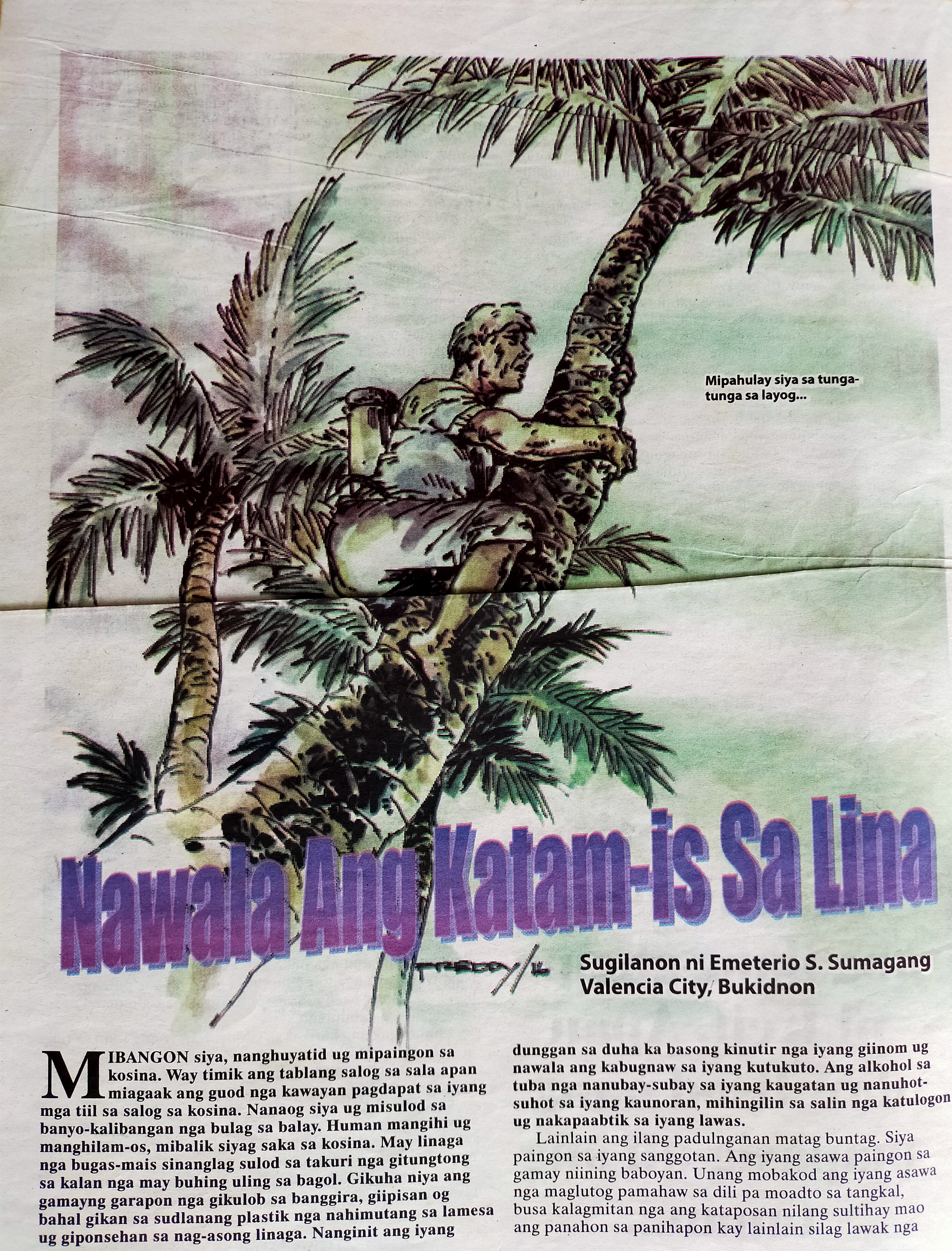 Una mokatkat sa layog, mihangad siya sa ibabaw. Halos di na makita ang duha ka sugong nga daw mga puya nga malinawong nanagtutoy sa bungol. Dala sa nabatasan, nanguros siya sa wala pa magsugod pagkatkat. Gihikap niya ang gansangong punoan sa lubi nga hinam nagpaabot sa gakos sa niwang apan lubason nga mga bukton. Nagsugod ang iyang pagsaka sa lubi sa unang tikang sa iyang walang tiil. Mikulismaot ang iyang nawong sa pagdapat sa iyang lapalapa sa hakhak apan daklit ra kadto kay giwakli niya sa iyang hunahuna ang gibating kaul-ol sa iyang lapalapa ug tikod. Sa dugayng katuigan sayon-sayonon lang niya ang pagkatkat sa lubi apan karon may bikil na ang iyang pagsaka tungod sa artraytis.