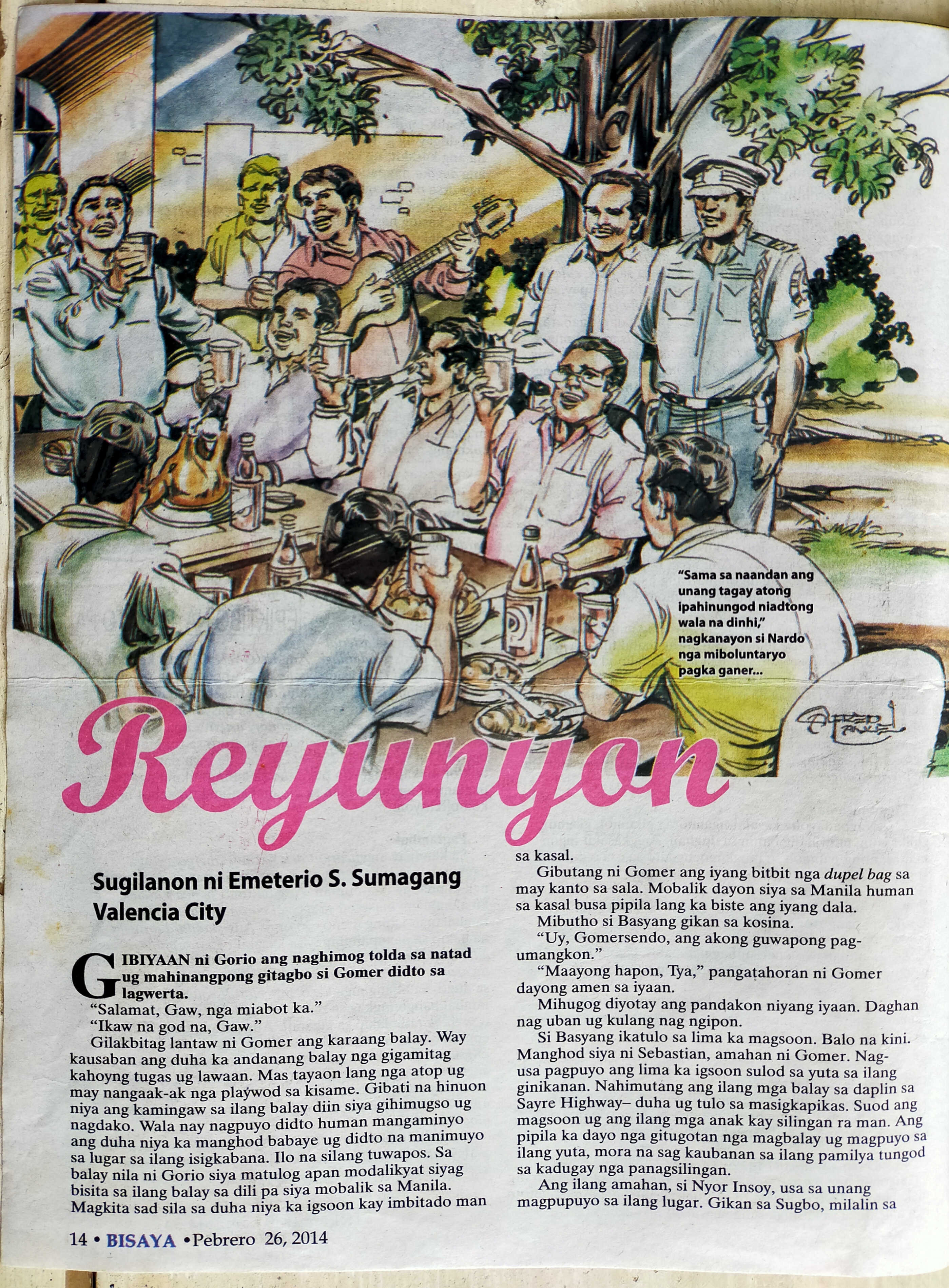 Dihang namauli na ang kadaghanan sa mga bisita, nagsugod dayog tapok-tapok ang kanhi kabarkada ni Gomer. Didto sila nag-inom sa silong sa dakong mangga sa likod sa balay. Ang mga hamtong higala nag-alirong sa lamesa nga gipunsisukan sa binotelyang alak ug sumsomang letson ug kalderitang kanding. Si Gomer ang nahimong sentro sa atensyon kay kinse anyos nang wa igkita. Nahinangop sila sa wala damhang pagtungha niini.