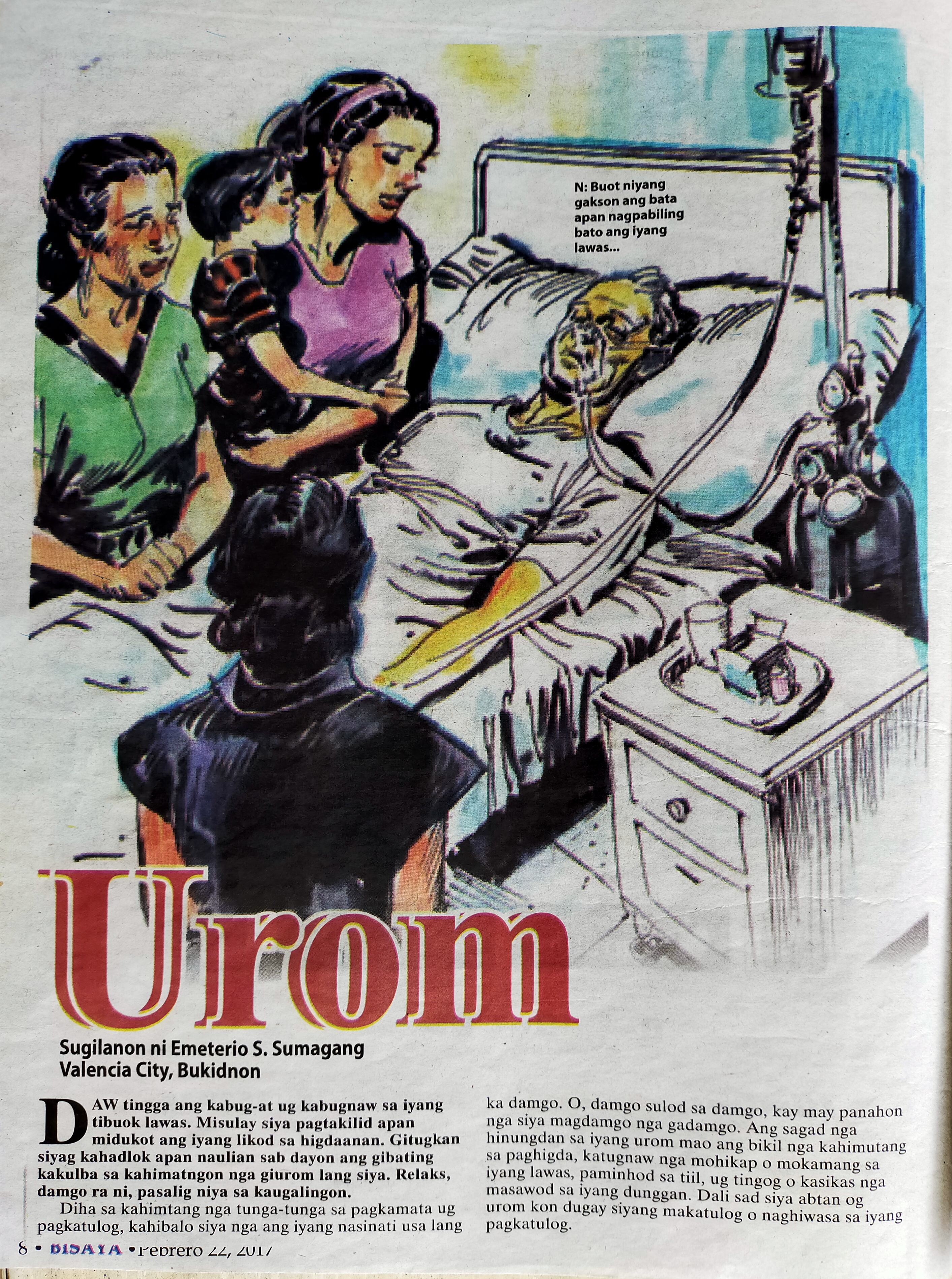 “Ambot sad bitaw ning atong mga bana, Sis, uy. Si Gaspar mao gihapon ang bisyo bisag hugot gidid-an sa doktor. Morag dili senior citizen. Pilosopo ra bag badlongon, mangatarungan nga kon di motagay, patay; kon motagay, patay; maayo pa motagay. Yuna, unsay sulti sa doktor sa iyang kahimtang?”